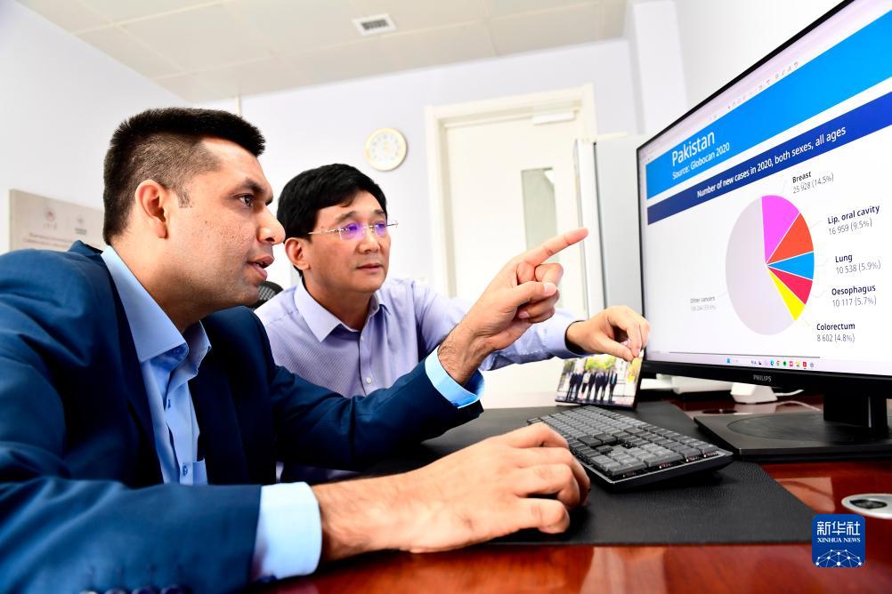 10月16日,在山東大學齊魯醫學院,默罕默德·沙巴茲向賈繼輝教授介紹癌症在巴基斯坦的病發情況。