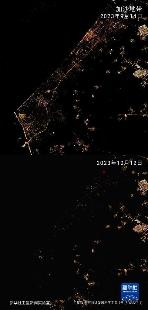 這張衛星影像拼圖顯示的是9月14日(上)和10月12日的加沙地帶及周邊地區夜景畫面。