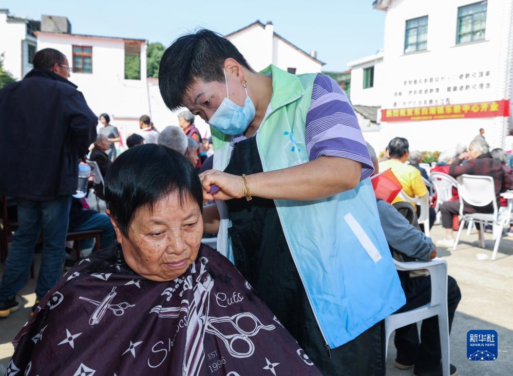 10月17日,志願者(右)在東白湖鎮樂齡中心給老人理髮。