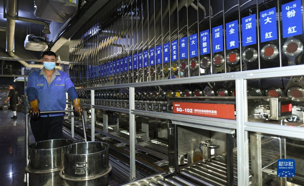 10月17日,浙江鴻大印染集團有限公司的工作人員在染料全自動稱料車間工作。
