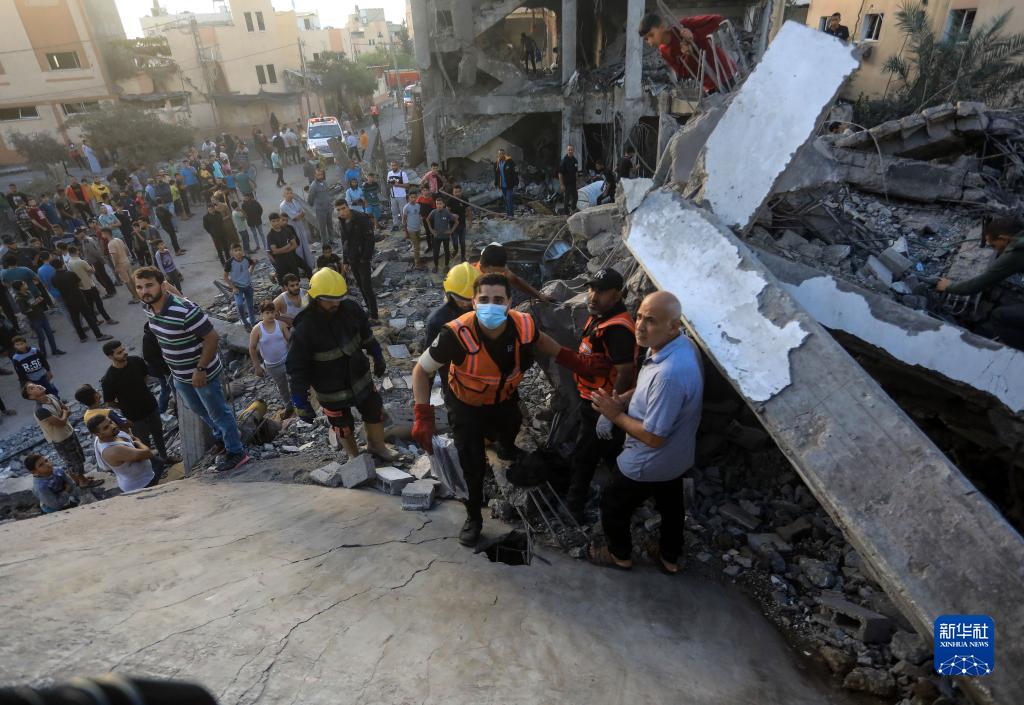 10月17日,在加沙地帶南部城市汗尤尼斯,人們在遭以色列襲擊損毀的建築中實施救援。