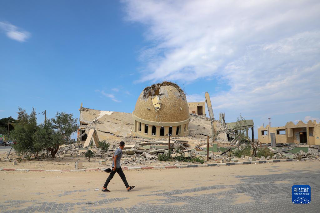 10月16日,在加沙地帶南部城市汗尤尼斯,一名男子從遭以色列空襲損毀的建築廢墟前走過。