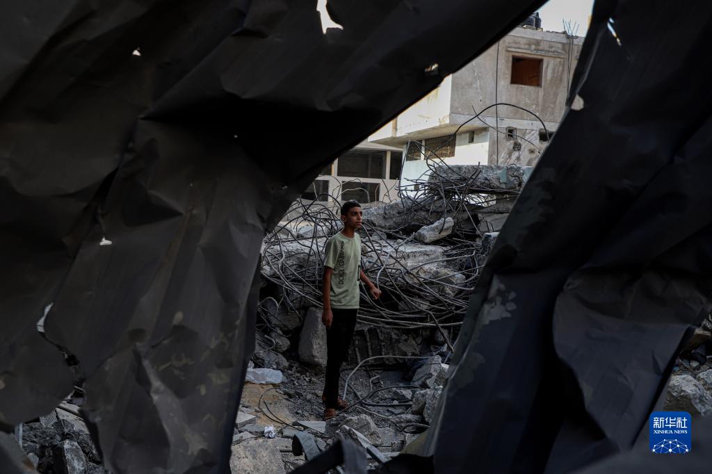 10月16日,在加沙地帶南部城市汗尤尼斯,一名男孩站在遭以色列空襲損毀的建築廢墟中。