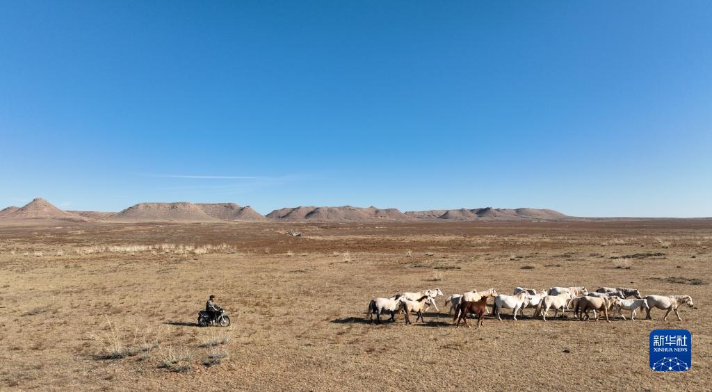10月16日,道爾吉在草原上驅趕馬群(無人機照片)。