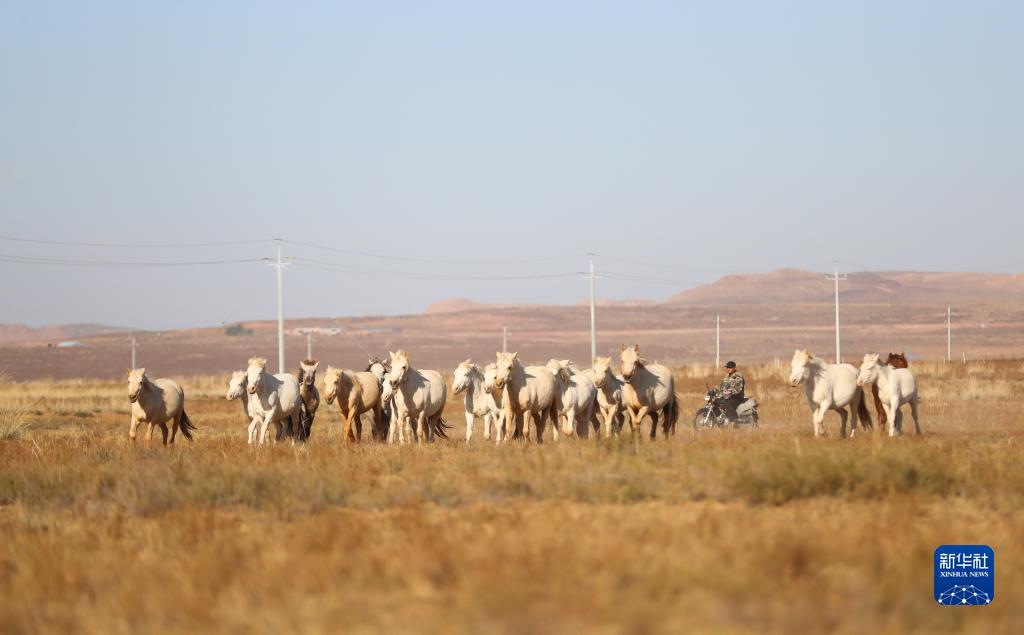 金秋時節,天氣轉涼,鄂爾多斯草原上一片金黃。牧民道爾吉騎着摩托車在草原上驅趕馬群,開始忙碌的一天。飲馬、趕羊是這個季節每天的工作。