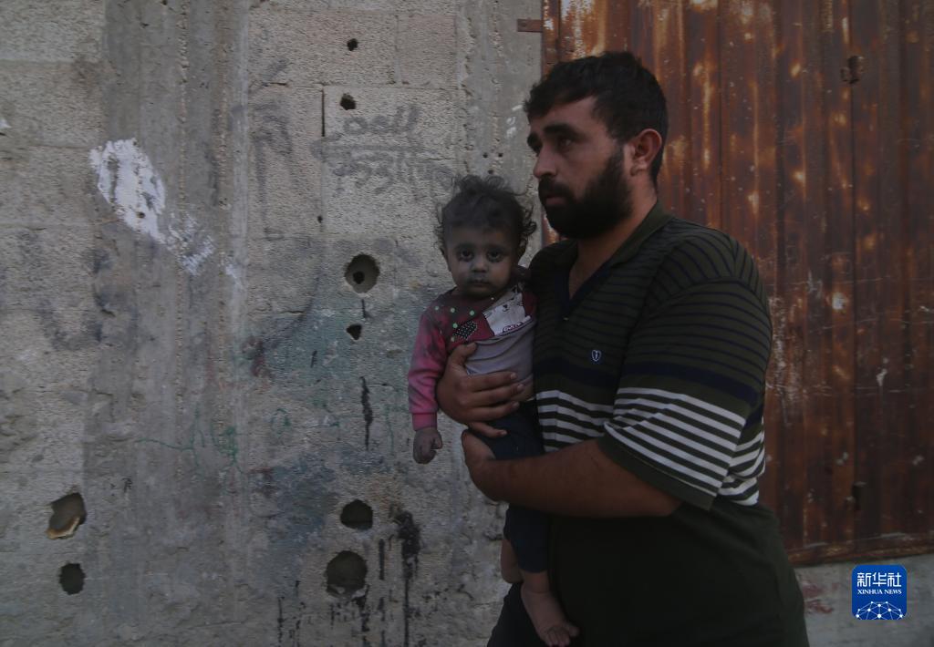 10月17日,在加沙地帶南部城市拉法,一名男子抱着受傷的孩子。