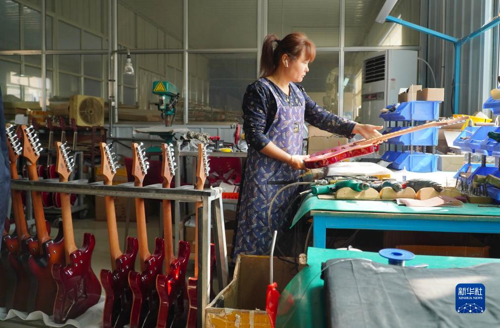 10月17日,在山東省昌樂縣鄌郚鎮的一家樂器生産企業,一名工作人員在生産加工電吉他。