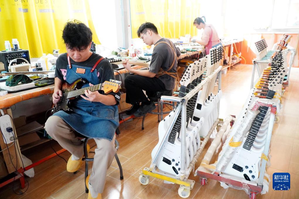 10月17日,在山東省昌樂縣鄌郚鎮的一家樂器生産企業,工作人員在調試電吉他産品。