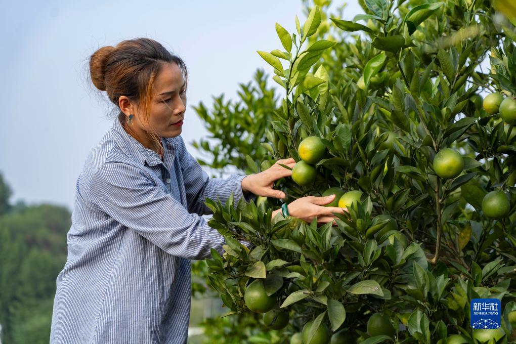 10月17日,在位於四川資中縣銀山鎮的橙堡魚鄉融合發展示範園,村民查看血橙挂果情況。