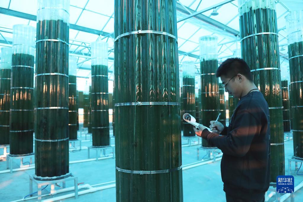 10月17日,園區工作人員在查看柱式養殖的螺旋藻情況。