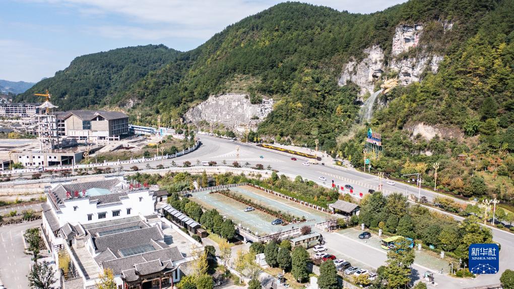新能源汽車在黔南布依族苗族自治州龍裏縣龍山鎮的充電樁設施充電(圖右下)(10月17日攝,無人機照片)。