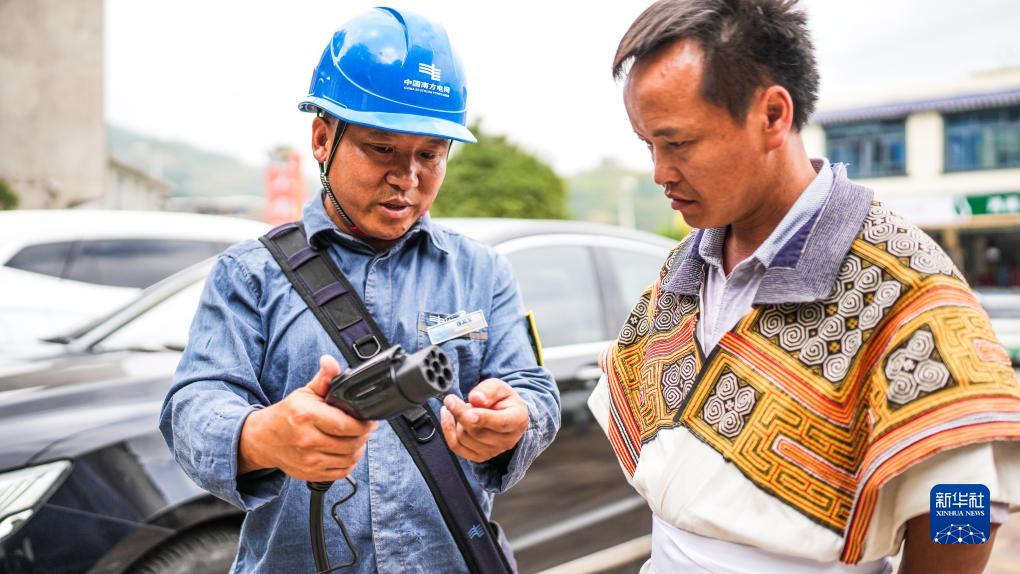 在六盤水市鍾山區青林苗族彝族鄉灰依村,南方電網六盤水供電局工作人員在指導當地群眾如何正確使用充電樁(9月22日攝)。