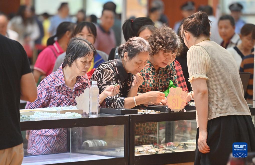 10月18日,觀眾在珠寶展上選購商品。
