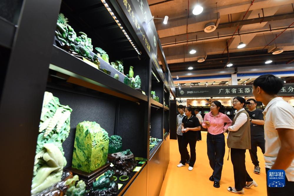 10月18日,觀眾在珠寶展上選購、鑒賞玉石。