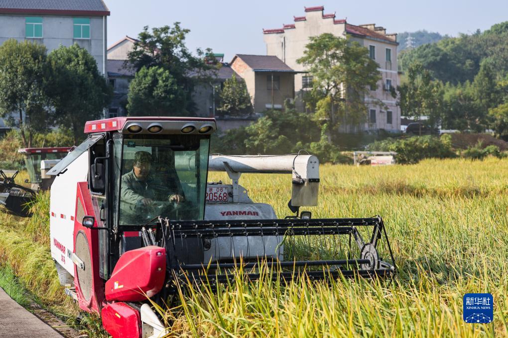秋收時節,浙江省諸暨市陶朱街道推行“企業+合作社+農戶”專業化糧食生産加工一條龍模式,指導農戶搶抓天氣晴好的有利時機,加快秋收進度,提高秋收效率,確保糧食顆粒歸倉。