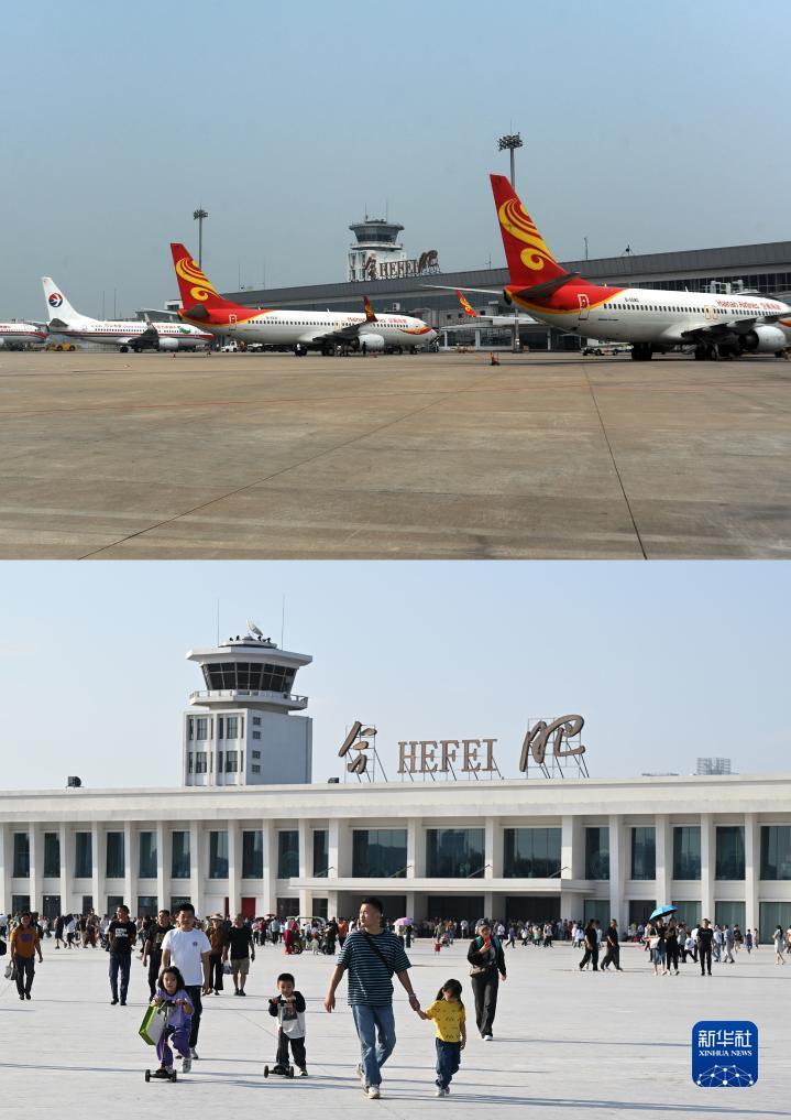這是一張拼版照片:上圖為2013年5月24日,客機停在合肥駱崗機場停機坪上(新華社發 黃洋洋攝);下圖為2023年9月30日,游客在合肥駱崗公園參觀(新華社記者周牧攝)。