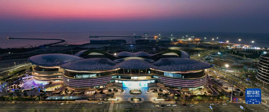 夜色中的海口國際免稅城(前)和海口新海港客運綜合樞紐項目(後)(2023年4月4日攝,無人機照片)。