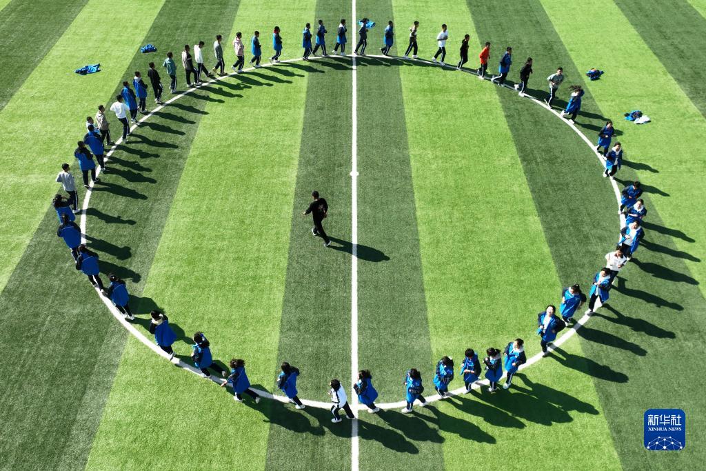 10月16日,蘭州新區高級中學的學生在上體育課(無人機照片)。
