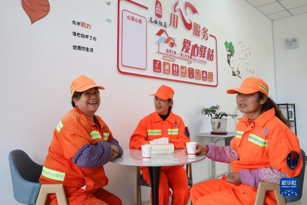 10月17日,環衛工人在蘭州新區西岔園區文曲社區的愛心驛站休息。