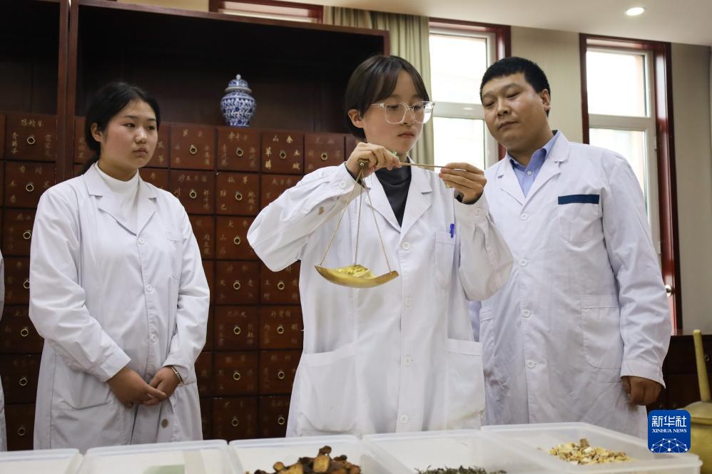 10月17日,在甘肅省蘭州新區科教園區,甘肅省衞生職業學院中醫藥學院的學生在中藥調劑實訓室進行實訓課程。