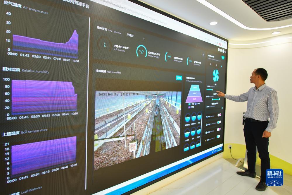 10月18日,在湘潭市雨湖區姜畬鎮泉塘子村,一家食用菌生産企業的工作人員在介紹用於菇房管理的5G智慧農業物聯網系統。