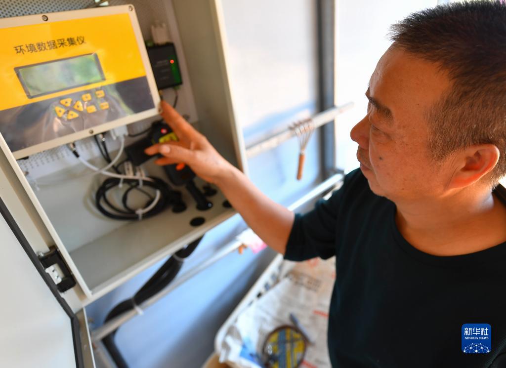 10月18日,在湘潭市雨湖區姜畬鎮泉塘子村,技術人員在“5G智慧小菇房”查看環境數據採集儀運行情況。
