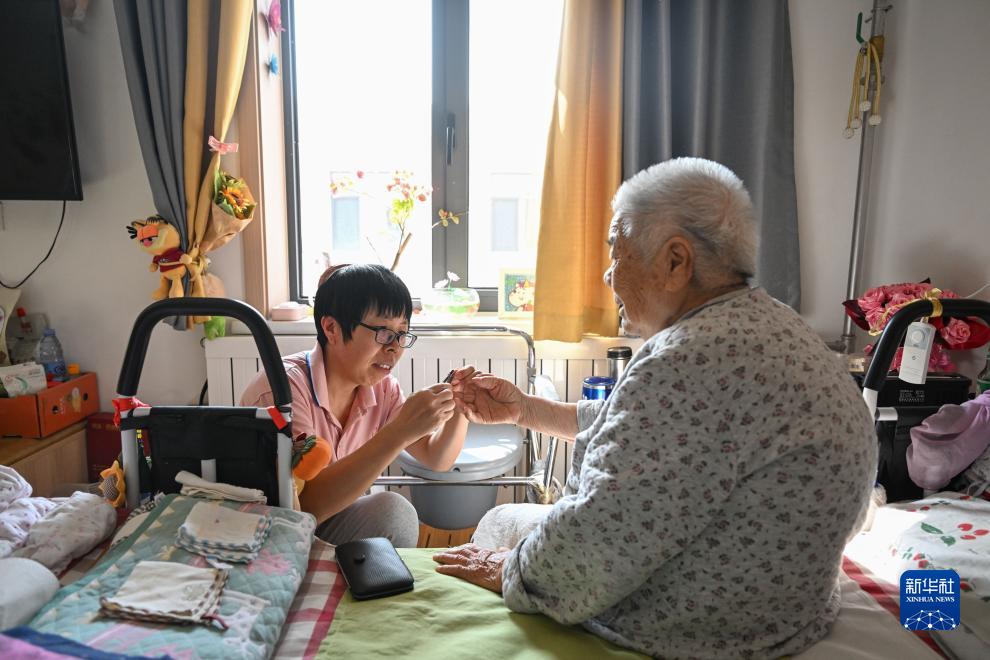 10月17日,工作人員在天津市河西區越秀路街道居家養老服務中心為老年人修剪指甲。
