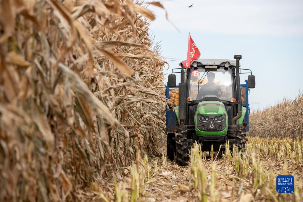 10月18日,在黑龍江省綏化市北林區張維鎮潤地農業種植合作社的一處玉米地,拖拉機運輸剛剛收穫的玉米。