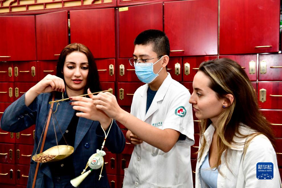 10月18日,在青島西海岸新區中醫醫院,山東科技大學國際交流學院伊朗籍留學生哈畀蒂(左一)在體驗中藥稱重。