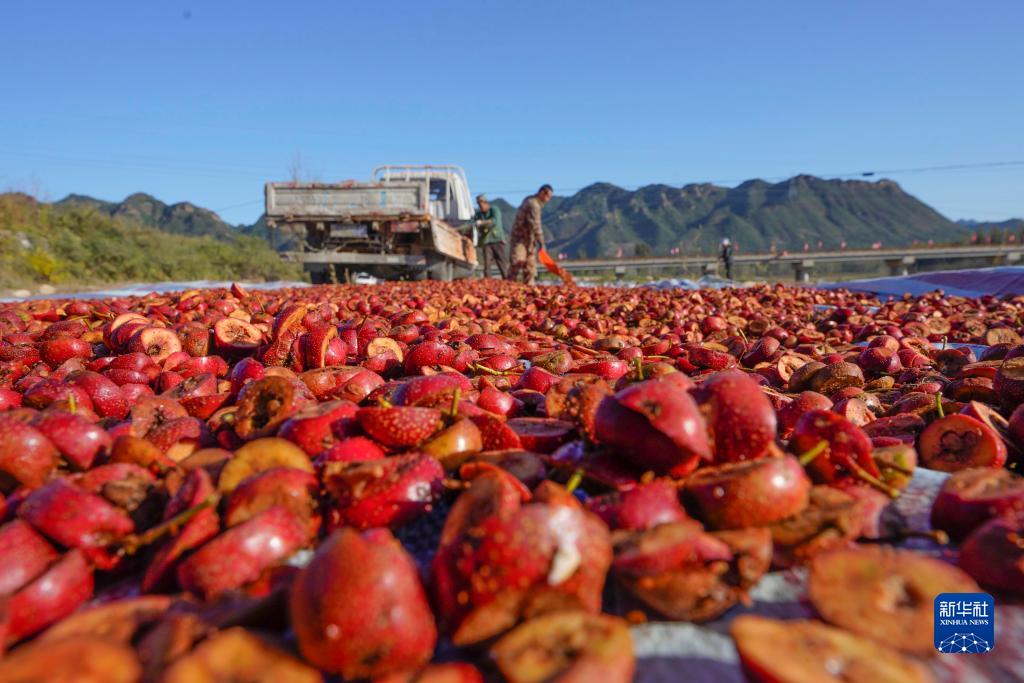 10月18日,農民在河北省遵化市一家果品專業合作社曬場晾曬山楂幹。