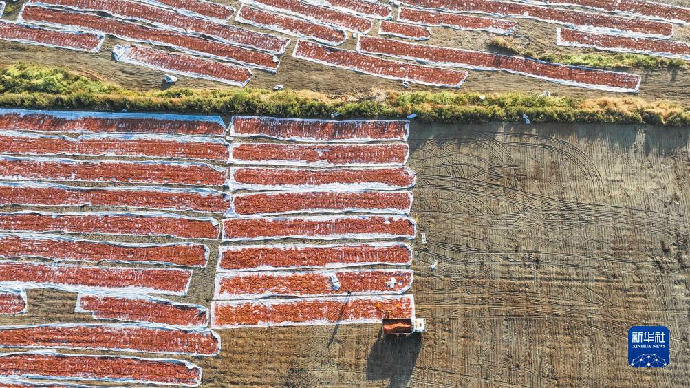 10月18日,農民在河北省遵化市一家果品專業合作社曬場晾曬山楂幹(無人機照片)。