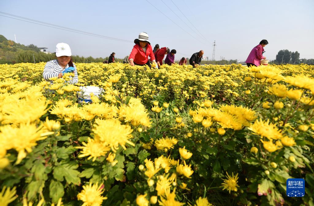 10月17日,河北省石家莊市平山縣北紅岸寨村農民在田裏採摘菊花。