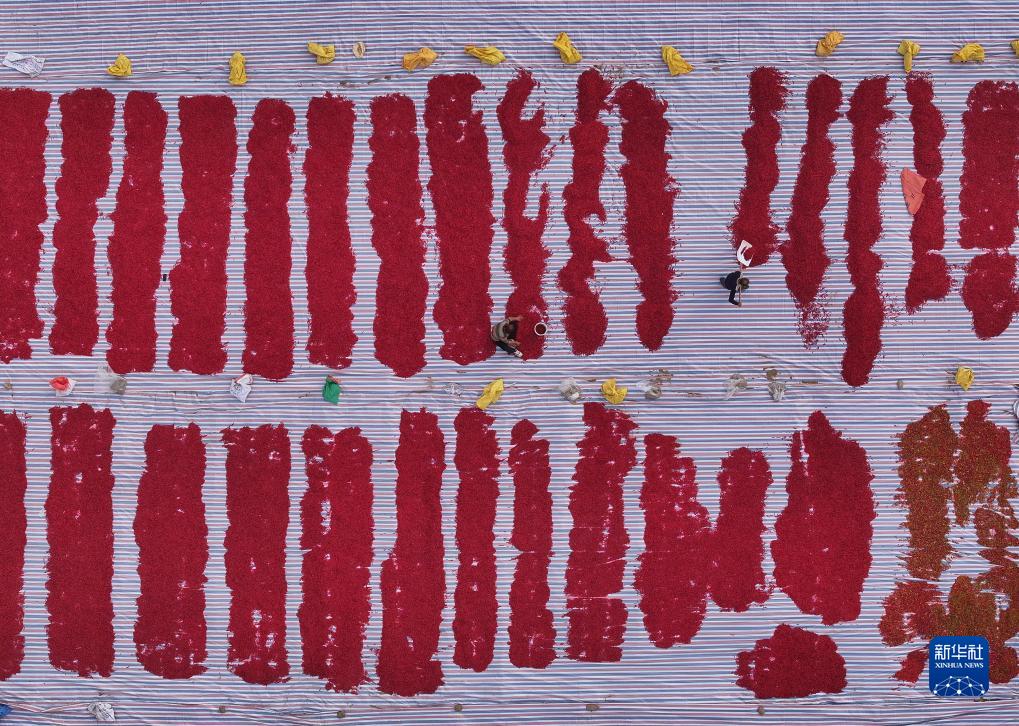 10月18日,河北省唐山市遷西縣羅家屯鎮西寨村農民在整理辣椒(無人機照片)。