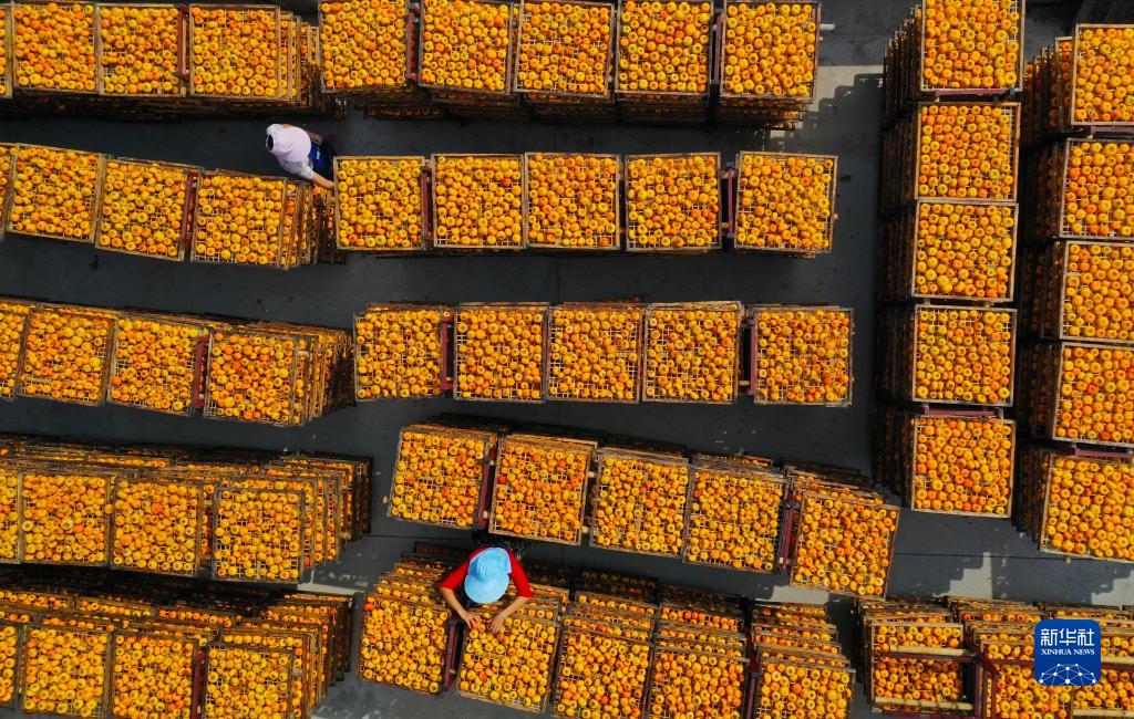 10月18日,在廣西桂林市恭城瑤族自治縣嘉會鎮泗安村,村民在整理月柿(無人機照片)。