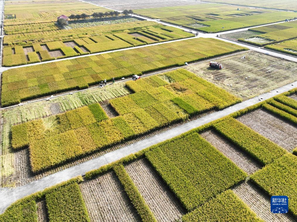 10月18日,在江蘇裏下河地區農科所(揚州市農科院),農民駕駛收割機在稻田裏收割水稻(無人機照片)。