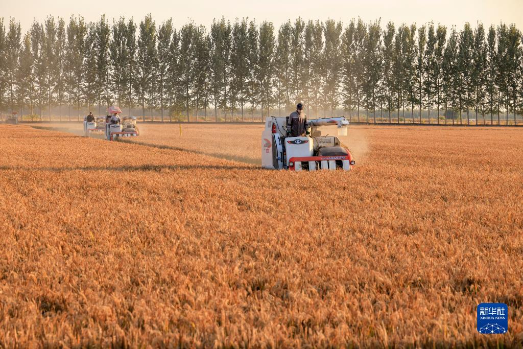 10月17日,河北省唐山市豐南區夏新莊村農民駕駛收割機收割水稻。