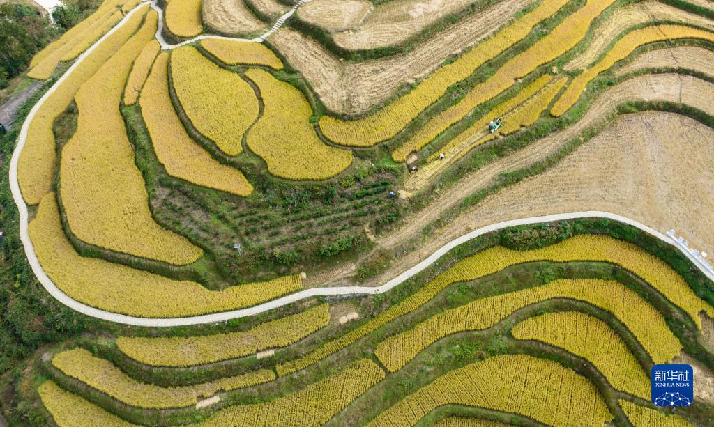 10月18日,村民在湖北省宜昌市秭歸縣長春村稻田裏收割水稻(無人機照片)。