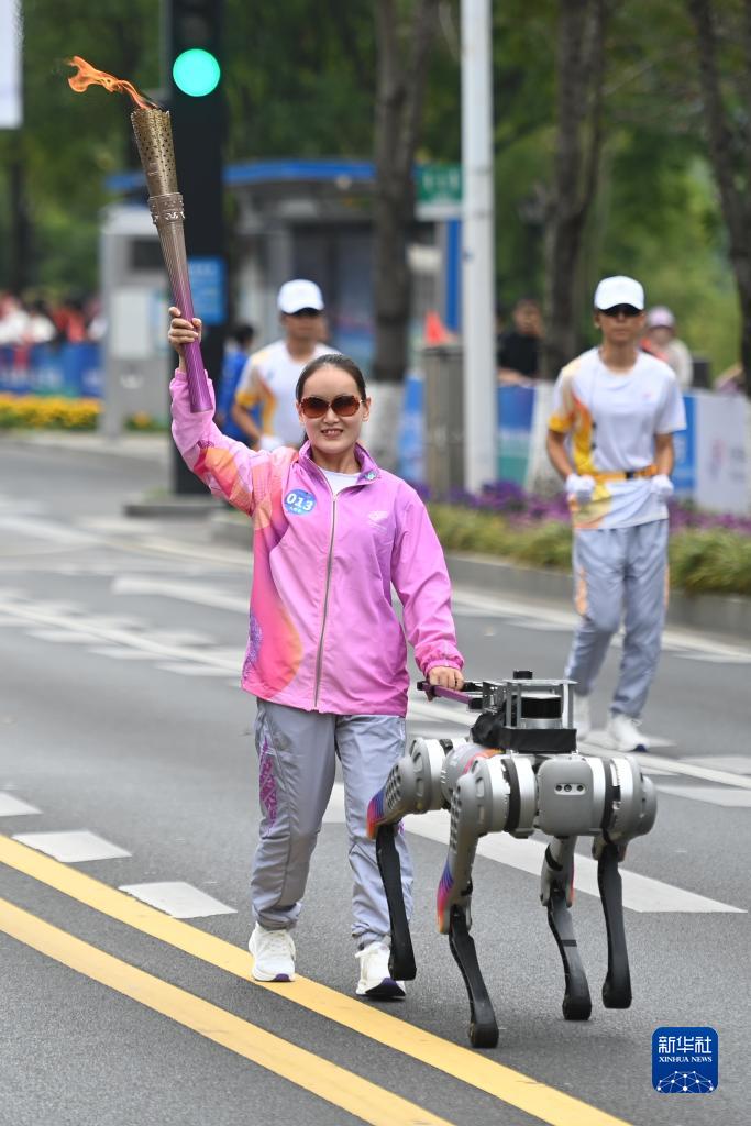 10月19日,火炬手蔡琼卉在智能導盲犬的引導下進行火炬傳遞。這是智能導盲犬首次在大型賽事火炬傳遞中亮相,它以四足智能機器人視覺識別能力引導視障殘疾人行走。