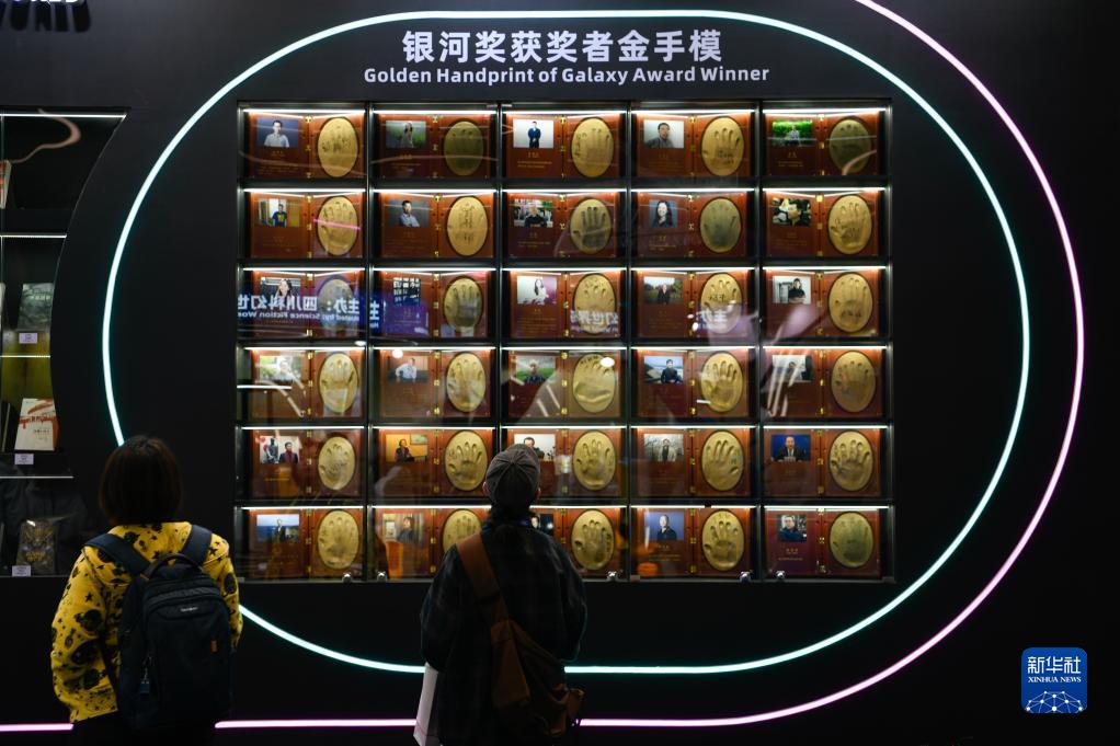 10月18日,觀眾在2023成都世界科幻大會主題展覽上觀看歷屆銀河獎獲獎者金手模。