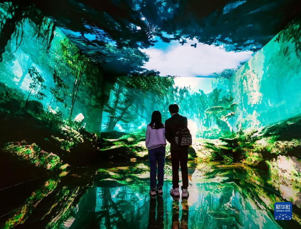 10月18日,在2023成都世界科幻大會主題展覽上,科幻迷在沉浸式體驗空間觀看多媒體藝術作品。