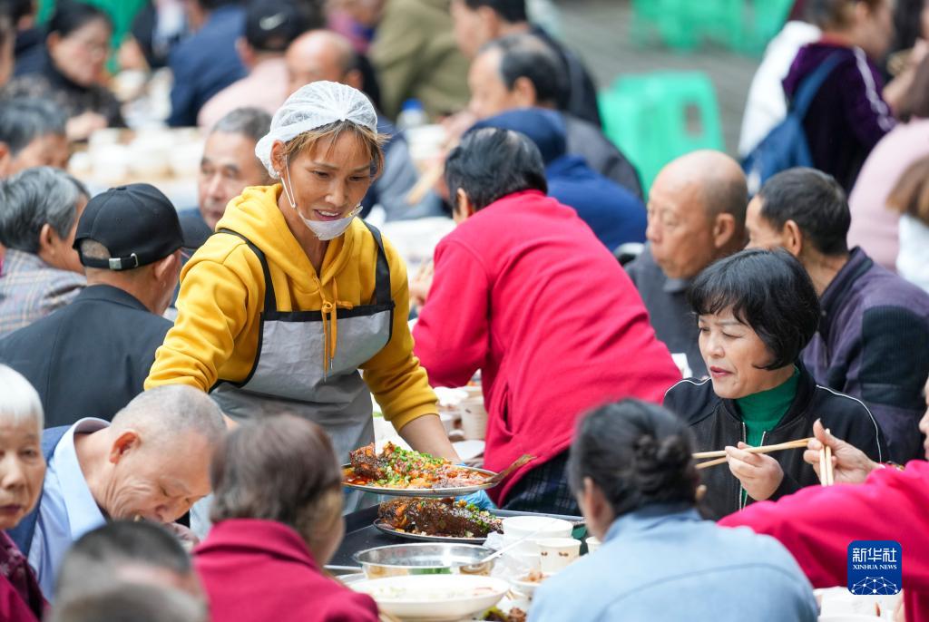 10月19日,重慶市九龍坡區華岩鎮石龍社區志願者在為參加“長壽宴”的老人們上菜。