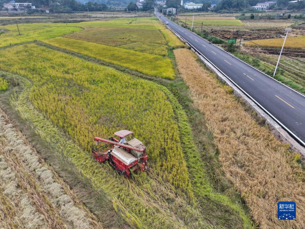 10月19日,在湖南省湘潭市雨湖區鶴嶺鎮晶鑫村,農戶駕駛農機在農田裏收割水稻(無人機照片)。