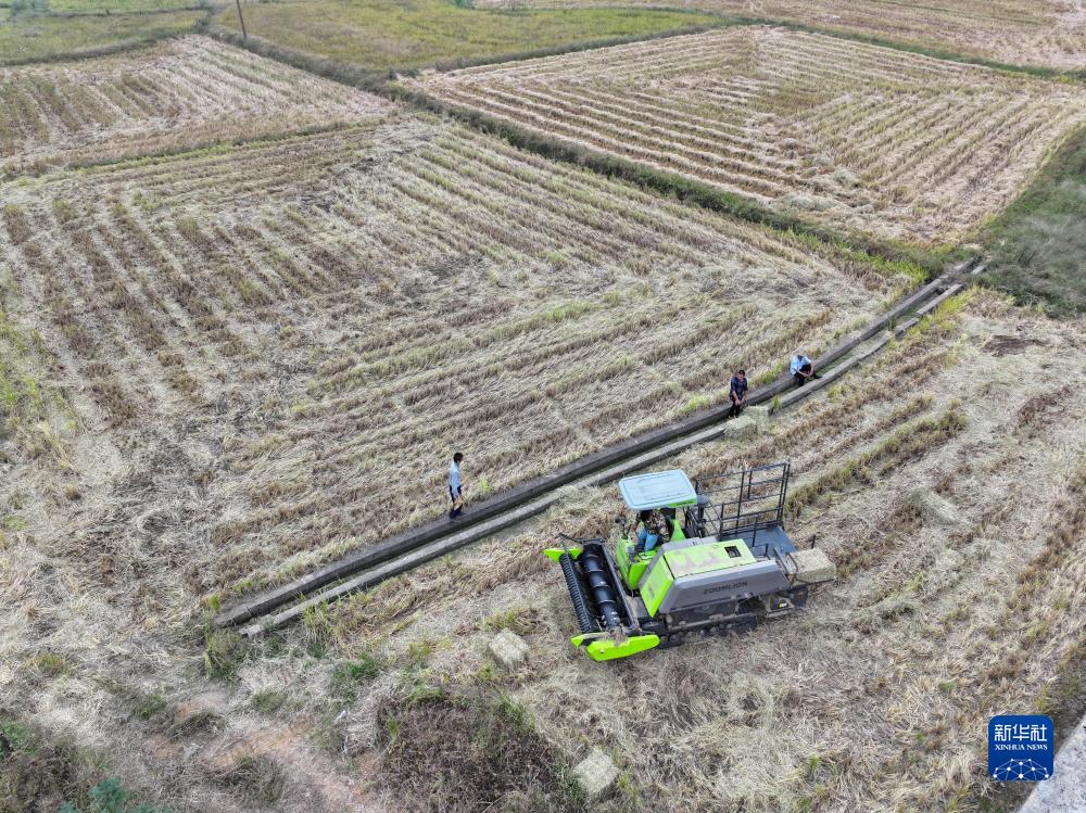 10月19日,在湖南省湘潭市雨湖區鶴嶺鎮晶鑫村,農戶駕駛農機在農田裏回收秸稈(無人機照片)。