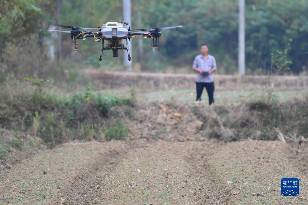 10月19日,在湖南省湘潭市雨湖區鶴嶺鎮晶鑫村,農戶操作無人機在田間管護油菜。