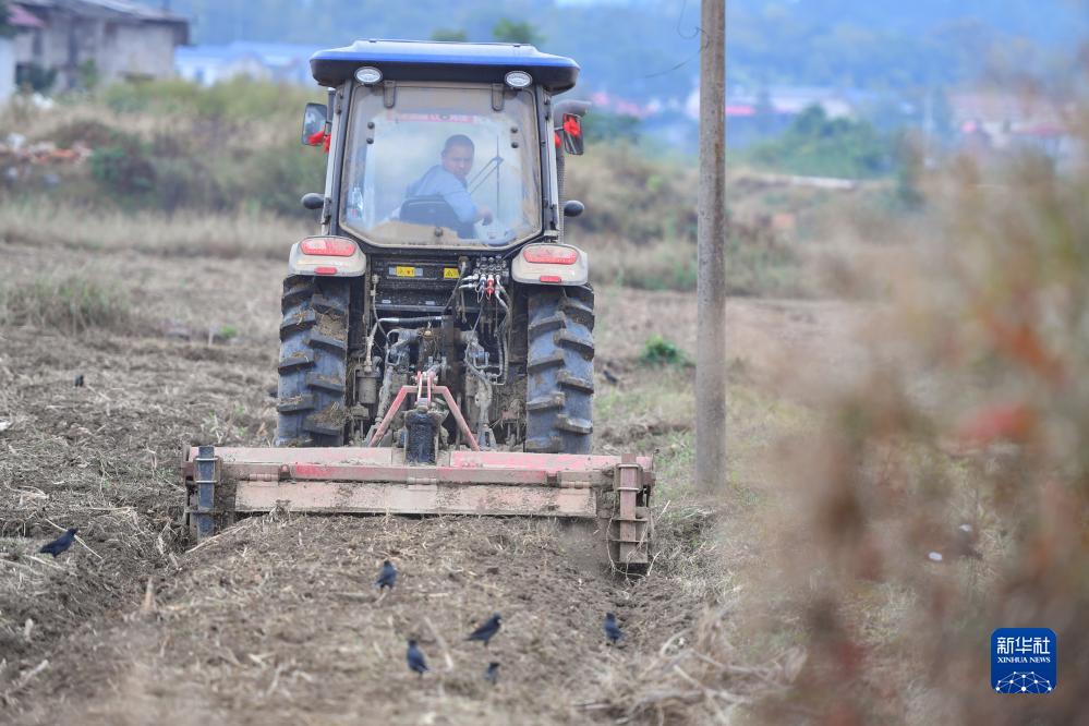 10月19日,在湖南省湘潭市雨湖區鶴嶺鎮晶鑫村,農戶駕駛農機在翻田開溝。