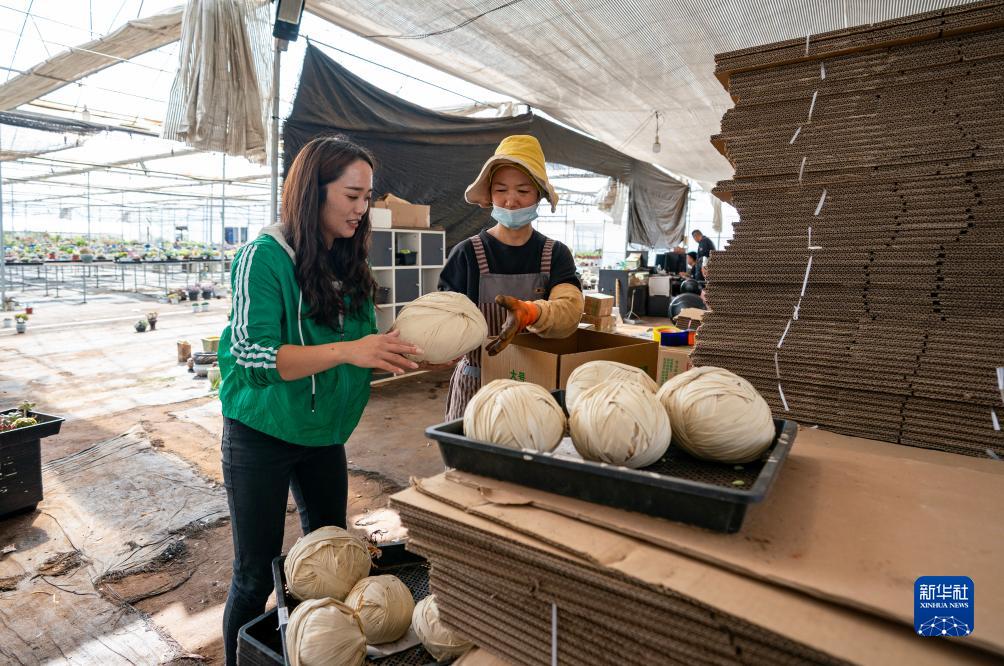 10月18日,李思敏(左)在位於晉寧區寶峰街道的多肉植物直播基地內幫助同事打包裝箱。