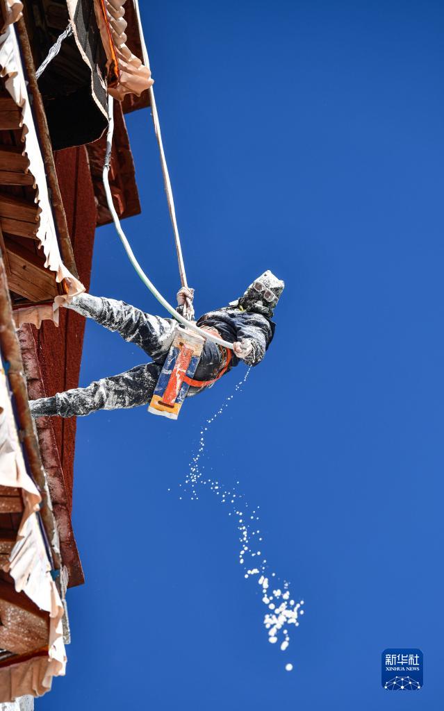 工作人員對布達拉宮外墻噴灑塗料(10月18日攝)。
