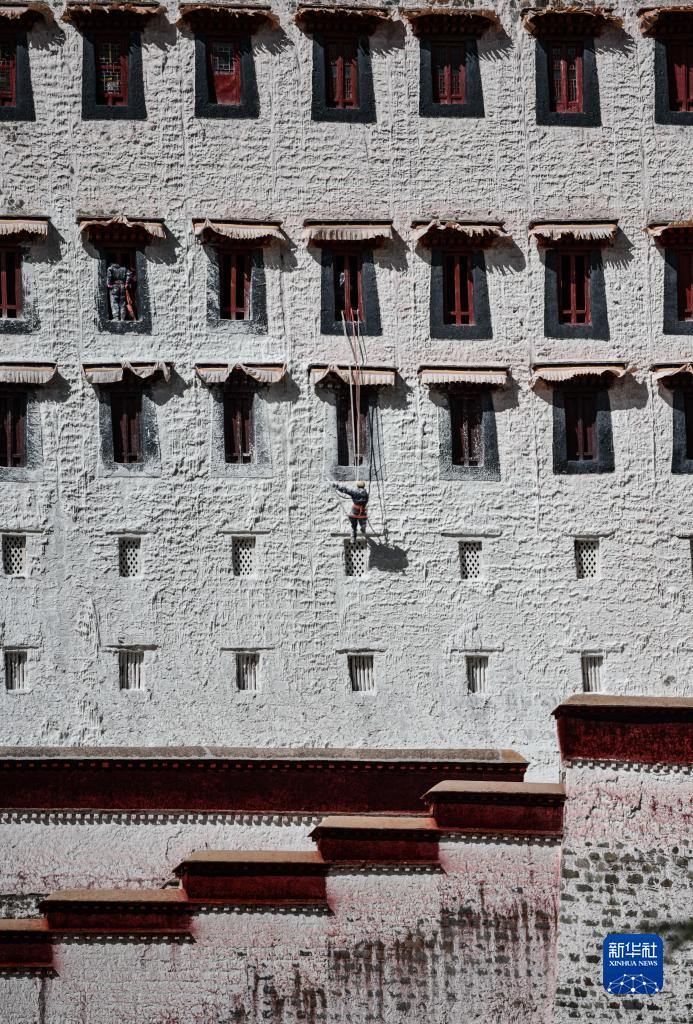 工作人員對布達拉宮外墻噴灑塗料(10月18日攝)。