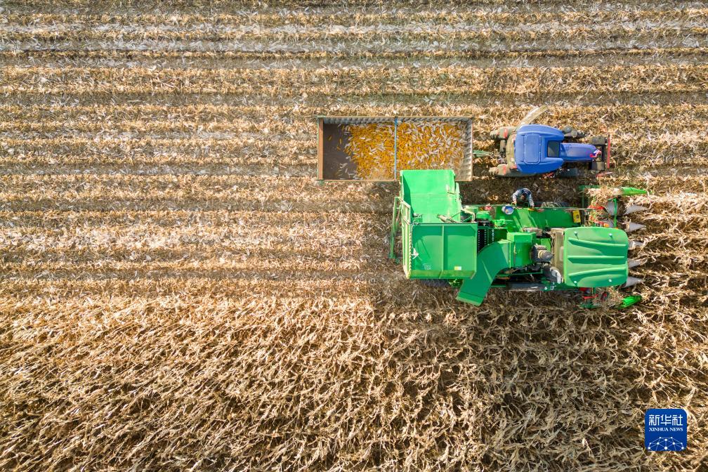 10月19日,收割機在齊齊哈爾市甘南縣中興鄉綠化村的一處玉米地收穫玉米(無人機照片)。