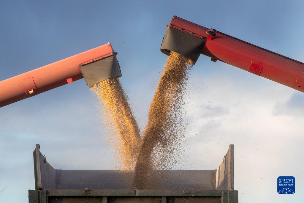10月19日,在齊齊哈爾市甘南縣中興鄉綠化村的一處大豆地,收割機卸下剛剛收穫的大豆。